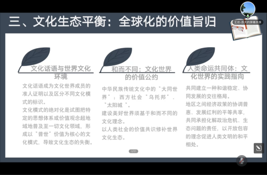 王欢同学指出,习近平新时代中国特色社会主义思想具有深厚的文化哲学意蕴。在微观层面,强调人是具有文化属性的存在;在中观意义上,指出人们在文化生产中形成独特的民族文化模式;在宏观视阈,认为人们可以在和而不同的文化理念下推动美好社会建设,特别是全球化背景下,必须形成人类命运共同体的价值共识,协同发展。