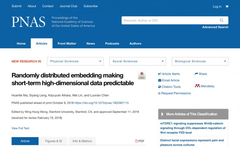 论文信息:“Randomlydistributed embedding making short-term high-dimensional data predictable” Huanfei Ma, Siyang Leng, Kazuyuki Aihara, Wei Lin, Luonan Chen,Proceedingsof the National Academy of Sciences, Oct 2018, 201802987; DOI:10.1073/pnas.1802987115