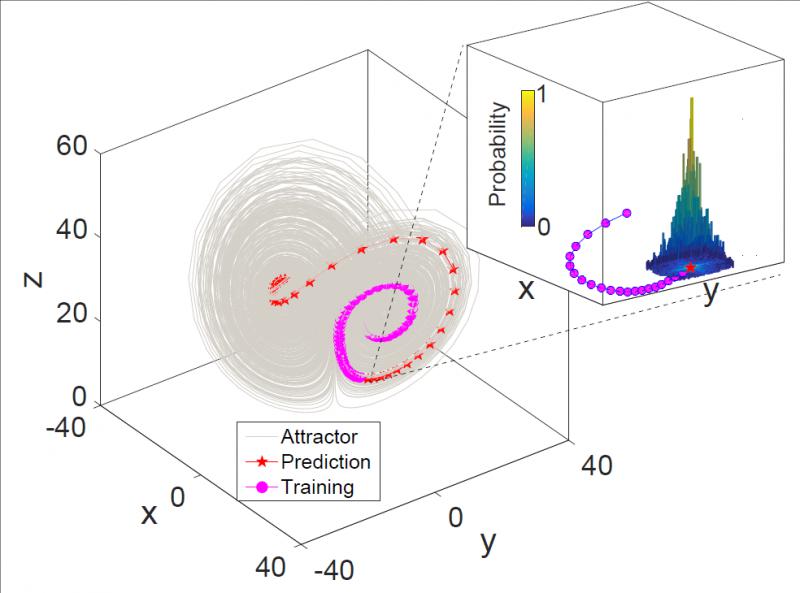 图1:即使学习数据只是吸引子的一部分样本,但RDE可以预测那些没有学习过的动态行为。放大图:基于分布的预测过程。