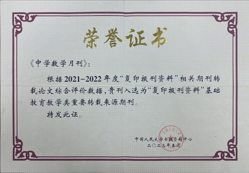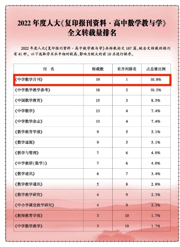此前,《中学数学月刊》已入选“2022年度人大复印报刊资料基础教育教学类(专业性期刊)高转载名录”。该名录依据复印报刊资料13种基础教育教学类重要期刊在2022年全文转载的论文数据产生。