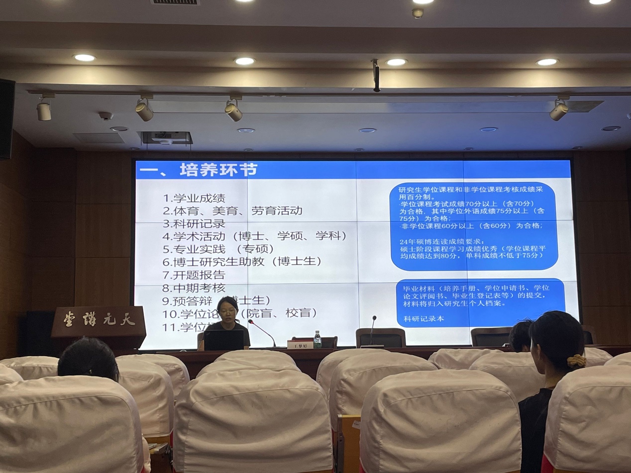 教务秘书王梦婷对研究生课程设置进行了详细介绍,分别针对博士研究生、学术型硕士、应用统计专业硕士和学科教学(数学)专业硕士的课程安排进行了细致讲解。她还特别提出了一些选课时需注意的要点,帮助同学们更好地了解课程,选择适合自己且感兴趣的学习内容。