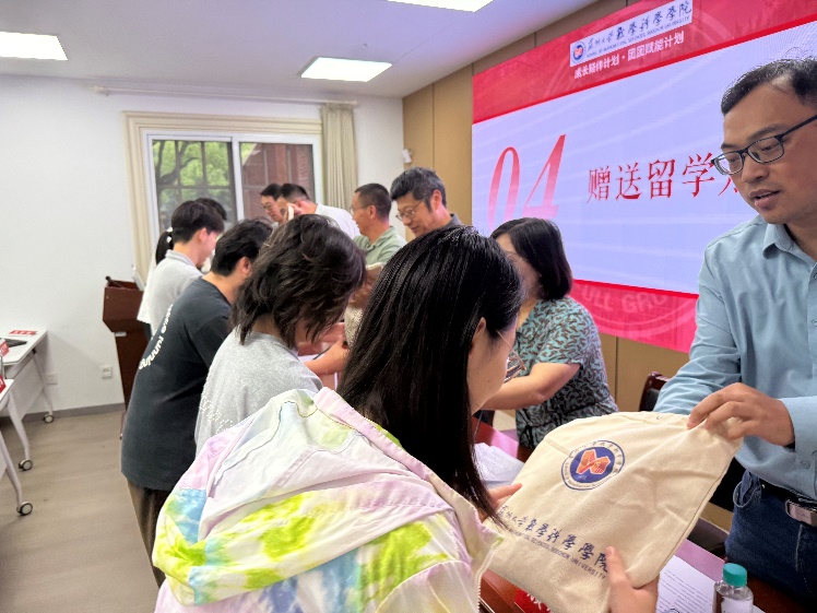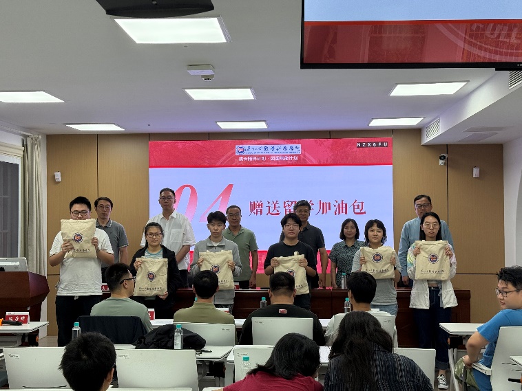 紧接着,学院领导与国际合作交流处的老师们共同为学子们送上精心定制的“留学加油包”。这份满载实用物资与诚挚祝福的礼物,承载着学院对学子的深切关怀与鼓励。