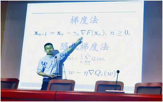 此外,为了让同学们更为直观地感受讲座中所说的“盲人摸象”,陈教授将他在机器学习领域的研究,浓缩成一段明了易懂的动画来向同学们展示。并以此为引子,用精炼而通俗的语言介绍了梯度法与随机梯度法的算法,从理论上解释了“盲人摸象”的过程。