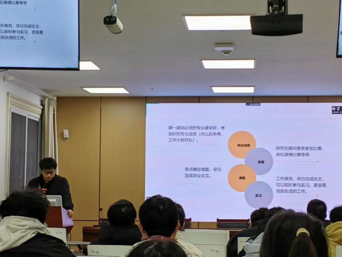 随后张彤同学和大家分享了在研究生期间如何平衡自己的学业和工作,实现时间的最大化利用。她以自己的亲身经历为例,阐述了在明确未来职业规划的前提下,通过参加本专业相关的比赛和基础课程学习等方式,更加专注于自身的发展前景,告诫同学们要保持初心,不随波逐流。与此同时,张彤同学还结合自己在面试过程中的经验,告诫同学们应当把握好每次汇报的机会,充分锻炼自己的能力。