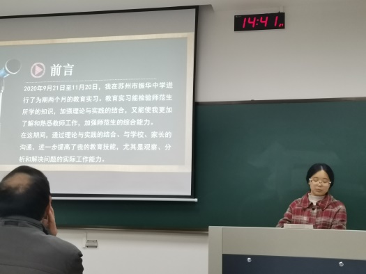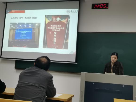 在校级优秀实习生的评选环节中,徐敬元、戴乐萱、陈子怡、俞鸿飞、严珮锦、孔雯晴等六位同学分别对自己两个月的实习工作进行了总结汇报。可以看出,每位同学在实习期间,在数学教学工作、班主任工作以及班级活动等方面,都贡献了自己的力量,收获颇丰。实习指导老师就每位同学的汇报与每位同学进行了深入的交流探讨,了解实习生与实习学校的情况。