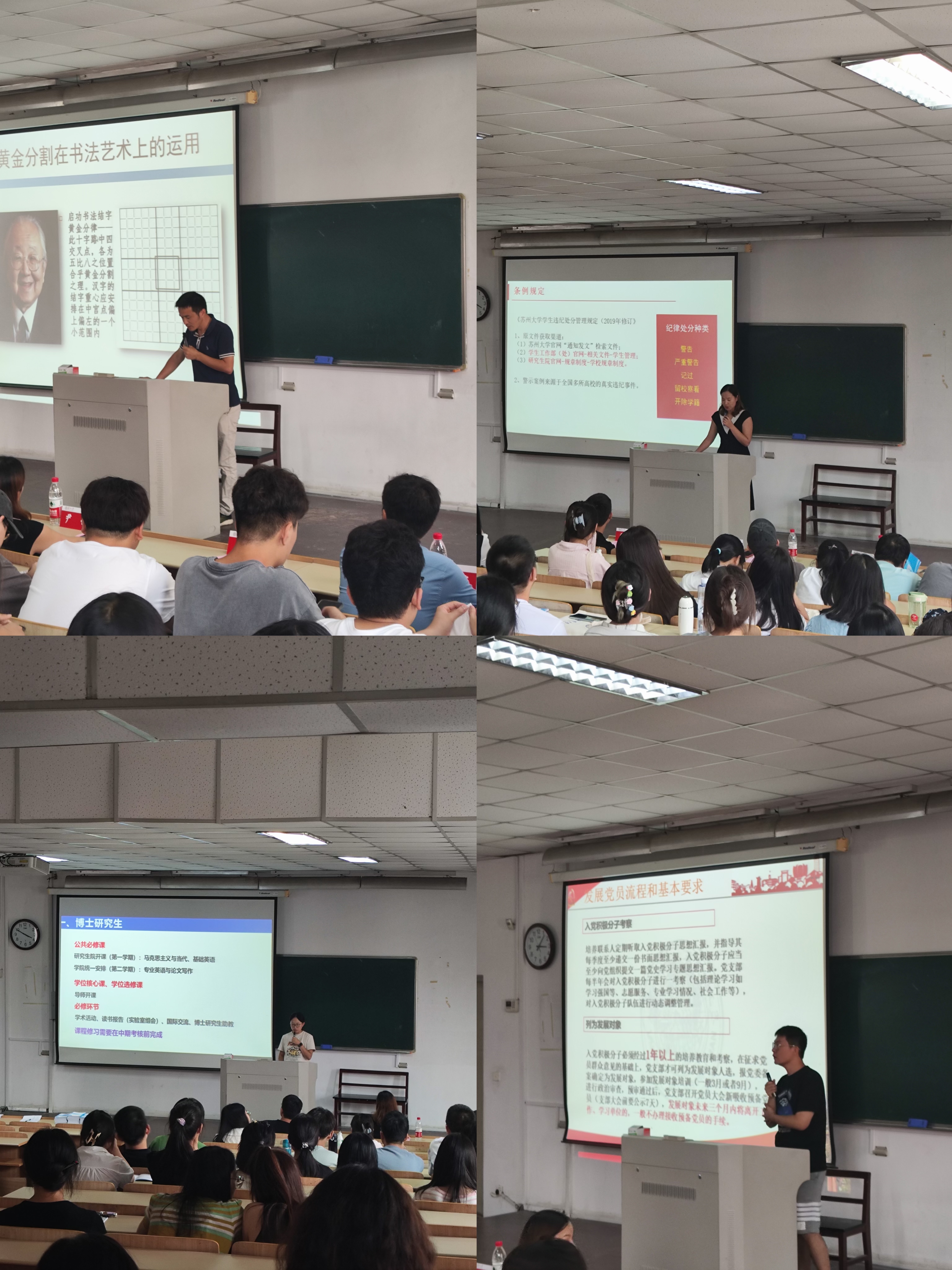 党委书记逢成华和党委组织委员乔治一起合作,以“落下天元人生的第一颗棋子”为主题,以黄金分割对书法艺术的影响为例,讲述了数学里的中国核心价值以及中国数学对世界的贡献,给研究生新生上了开学第一课。副院长王志国介绍了学院的悠久历史,雄厚的师资和突出的科研情况,解读学位点分布和学科建设以及学位培养方案,使研究生们对学院有了更深入的了解。