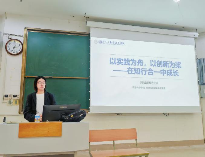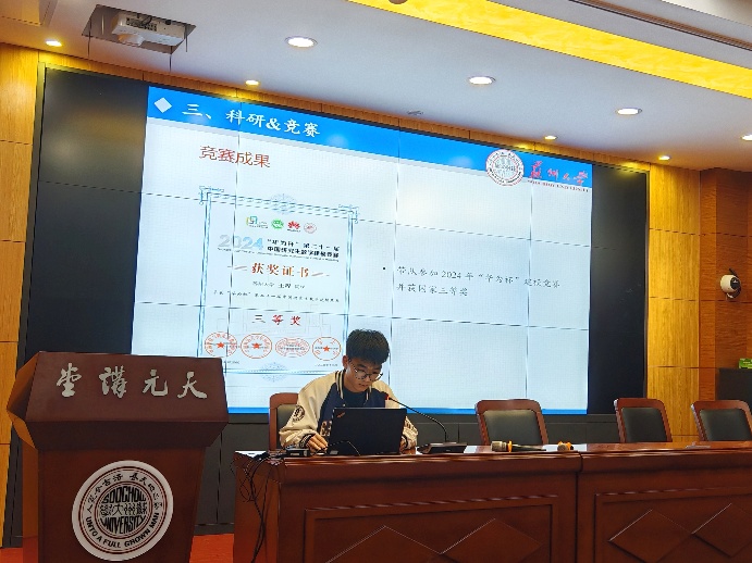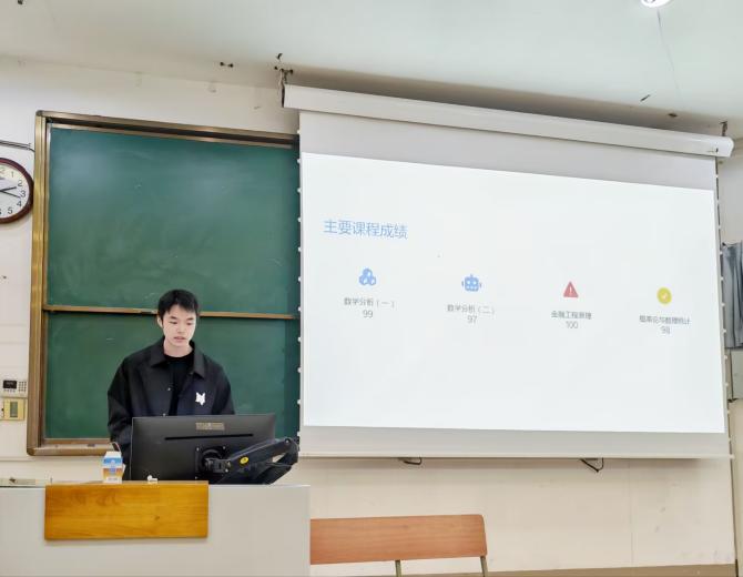 本科生首位宣讲人是2023级数学与应用数学专业的许宸瑜。他长期投身学生工作与志愿服务,累计时长超500小时,曾赴湖南乡村支教。他注重启发式教学,倡导“教育不是灌满一桶水,而是点燃一团火”。他以“小处不渗漏,暗处不隐欺,末路不怠荒”自勉,鼓励学弟学妹在点滴中成长,走好属于自己的大学之路。第二位宣讲人是2022级金融数学专业马添翼。他学业成绩优异,GPA达3.91,已保研至复旦大学。他分享了四点核心学习经验:吃透数学分析与高等代数基础;将抽象概念具象化理解;构建系统化知识网络;善用优质网络资源。同时,他建议合理规划时间,高效利用整块与碎片时间,并尽早通过英语四六级等关键节点,做到张弛有度,稳步提升。第三位宣讲人是来自2022级数学与应用数学专业的蒋迅。他出身贫寒,自幼与祖辈相伴。凭借不懈努力,他从乡村走进苏大,并通过转专业实现理想。在明确方向后,他积极备赛,屡获佳绩,最终保研本校。他以“悟已往之不谏,知来者之可追”激励自己不断前行,展现了逆境中奋起的坚韧品格。最后一位是2022级金融数学专业王星惠,GPA达3.8,已保研至东南大学。她强调科研应以问题为导向,学会简化复杂公式,提升研究成果的可理解性;在竞赛中要多角度思考,广泛参考不同教材;在实践中则要敢于试错、勇于创新。她坚信:“创新不是灵光一现,而是在问题中扎根、在困难中坚持、在过程中成长。”