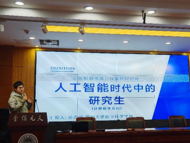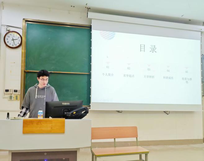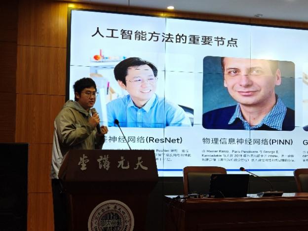 研究生第一位宣讲人王程同学以科研竞赛经历为切入点,分享了带领团队攻坚克难的历程。他详细拆解了竞赛中复杂问题的模型修正技巧、时间紧迫下的团队协作方法,更坦诚地讲述了从失利中复盘反思、重拾信心的感悟。一句“流水不争先,争的是滔滔不绝”,生动诠释了科研路上的坚守与热爱,深深触动在场同学。第二位宣讲人孙羿斐同学以“人工智能时代中的研究生”为主题分享经验。结合本科直博经历,他为新生剖析了学术道路规划的关键,强调了科研与论文写作能力的核心价值。随后,他深入浅出地解读了残差神经网络、物理信息神经网络等人工智能方法的关键节点,以及经典偏微分方程的实际应用,拓宽了同学们的学术视野,提供了清晰的科研指引。