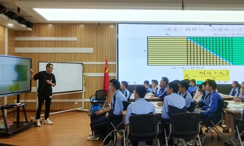 首先,同学们观摩了两节“中华优秀传统数学文化进课堂”的汇报课,分别是孙冲老师的《祖暅原理与柱体、锥体的体积》以及饶彬老师的《中国古代数学家求数列和的方法》。孙冲老师通过设计移动小棒、硬币等多个实验,让学生直观感知并理解祖暅原理,切身经历由“线动成面”类比出“面动成体”中的祖暅原理全过程,并应用祖暅原理推导柱体和锥体的体积公式。而饶彬老师采用分组合作的学习方式,通过生活情境和历史情境引入课题,进而介绍中国古代数学家数列求和的方法——垛积术。饶彬老师同样也采用了实验的方式引导学生探究、推导求和公式,将一次幂和类比到二次幂和,并进一步拓展到三次幂和。
