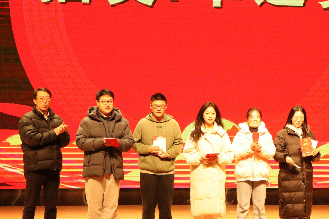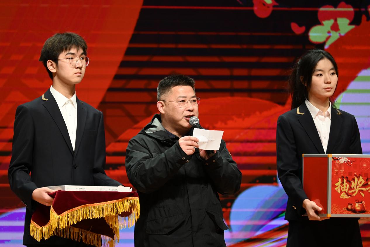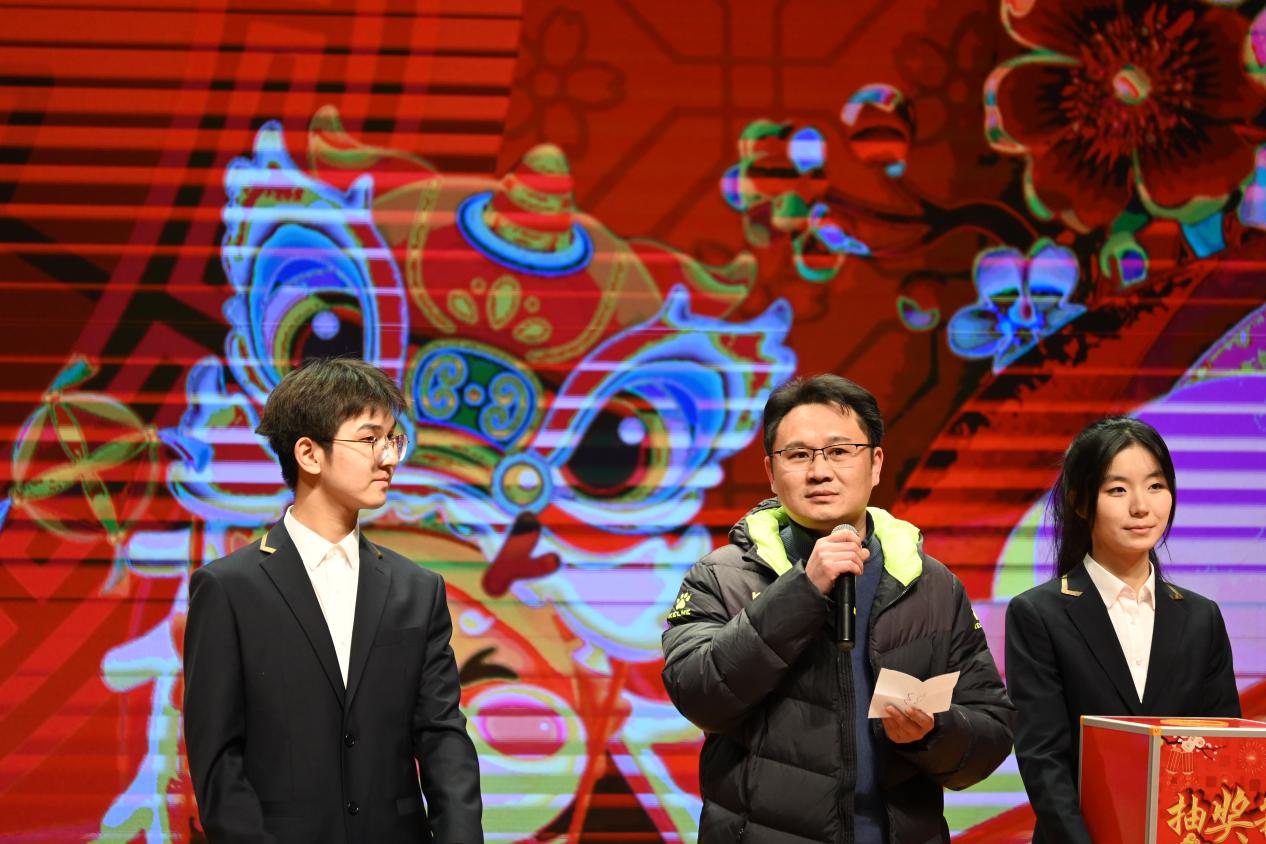 工会主席陈富军老师受邀上台在现场抽取了两位二等奖幸运观众,对在场的同学们和老师们表达了新年美好祝愿。