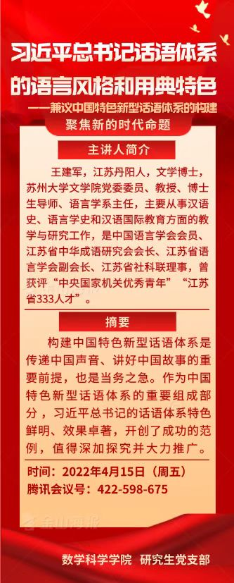 为进一步做好疫情防控期间学生的思想政治教育工作,提高党员和学生骨干的思政修养和人文素养,增强学生的理论知识储备,丰富防疫期间的学习生活,4月15日晚7:00,我院开展了党员和学生骨干培训课程,课程以“习近平总书记话语体系的语言风格和用典特色”为主题,由特邀嘉宾王建军教授主讲,学院党委书记逢成华老师、副院长王志国老师、辅导员尹伊老师、研究生秘书王梦婷老师以及全体研究生党员和学生骨干出席了本次活动。