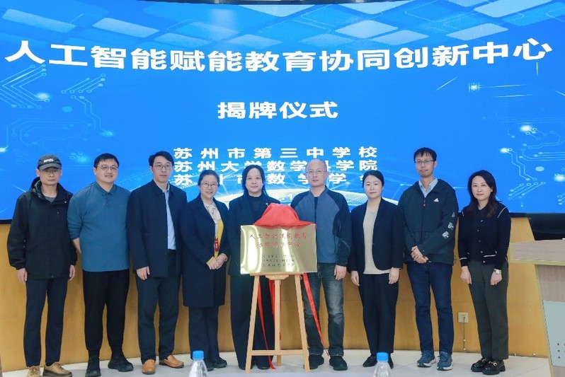 2026年4月16日,由BW·西汉姆联、苏州市第三中学、苏州市数学学会联合共建的“人工智能赋能教育协同创新中心”揭牌仪式隆重举行。学院党委书记朱今、副院长王志国,苏州市第三中学校长王旦、副校长倪英、教学处主任许颖、副主任施黎伟,以及学院数学教育教研室的部分师生参加仪式,共同开启校地协同、科教融合的数学教育创新篇章。