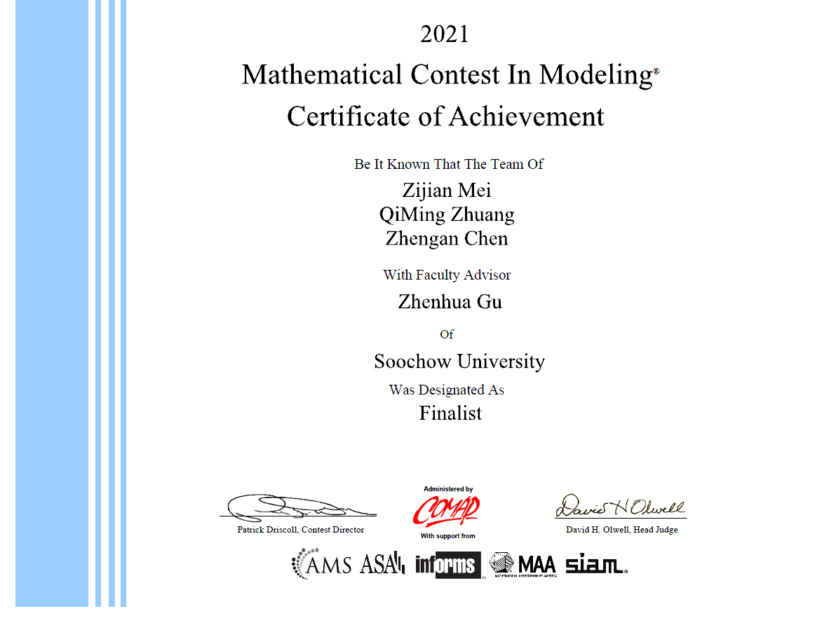 近日,2021年美国大学生数学建模竞赛(MCM/ICM)评审结果正式公布。我院6人获特等奖提名奖(Finalist),3人获一等奖(Meritorious Winner),38人获二等奖(Honorable Mention),获奖数量和获奖等级再创新高。