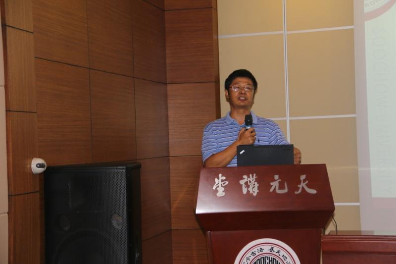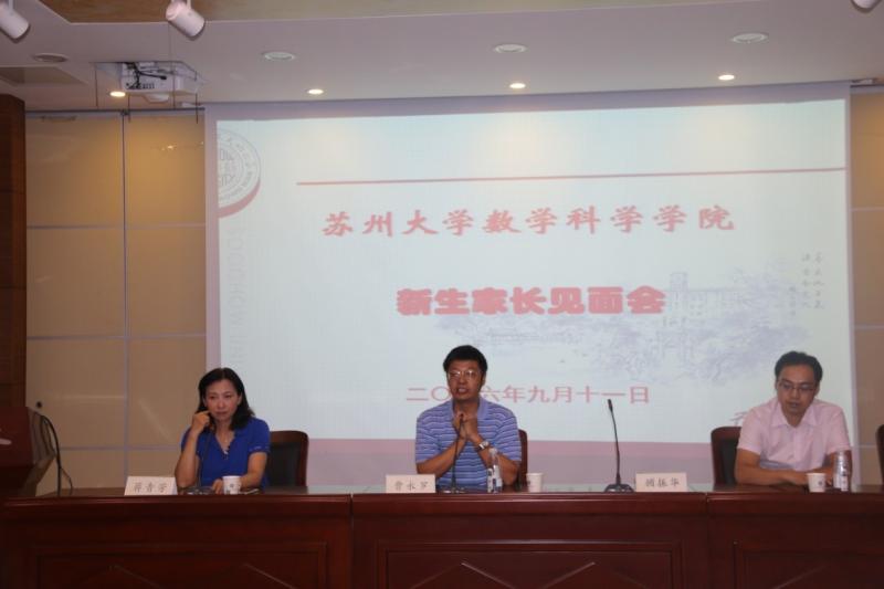 曹院长首先代表学院对2016级新生家长表示热烈的欢迎!向家长们介绍了数科院的整体情况以及改革开放以来学院的办学成绩。曹院长指出,在正视我院新生与国内顶尖高校同专业新生差距的基础上,学院始终坚持配备最优秀的教师担任一线教学任务,通过坚持晚自习、答疑质疑、举办读书班讨论班、专业竞赛辅导等多措并举,来帮助学生培养良好学习习惯、改进学习方法、扎实专业基础,从而缩小——比肩——甚至小部分超越顶尖高校同专业优秀学生。曹院长寄语2016级新生家长,希望他们和学院一起,通过帮助新生树立自信心、提高自我管理能力、培养艰苦奋斗精神,不断进步,超越自我!