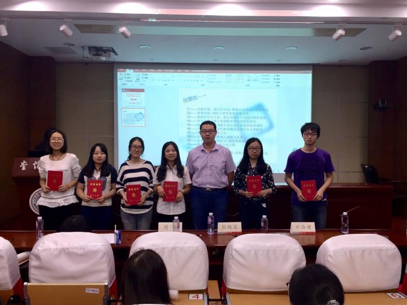 最后,评比结果由在场老师和同学投票产生。经过评选,“新兴产业密室逃脱在南方地区的发展趋势调研”团队、“看两岸历史关系,探访台湾首任巡抚刘铭传故居”团队获得一等奖,“嘉兴红色旅游发展现状”团队和“生也沙丘,死也沙丘,追忆焦裕禄精神”团队获得二等奖,另有四支团队获得三等奖,四支团队获得优胜奖。亓海啸老师为获奖团队颁发了奖状和证书并合影留念。