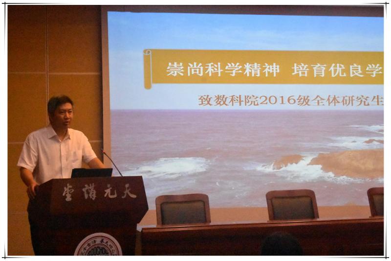 开学典礼结束后,院党委书记朱建刚以《崇尚科学精神 培育优良学风》为题给2016级研究生上了新生第一课。课上,朱书记为大家介绍了苏大的历史与现状,并结合学院近80年的办学历史介绍,勉励大家继承传统、刻苦钻研,他希望2016级全体研究生在学习科研过程中要崇尚科学精神,努力培育数科院特有的优良学风。