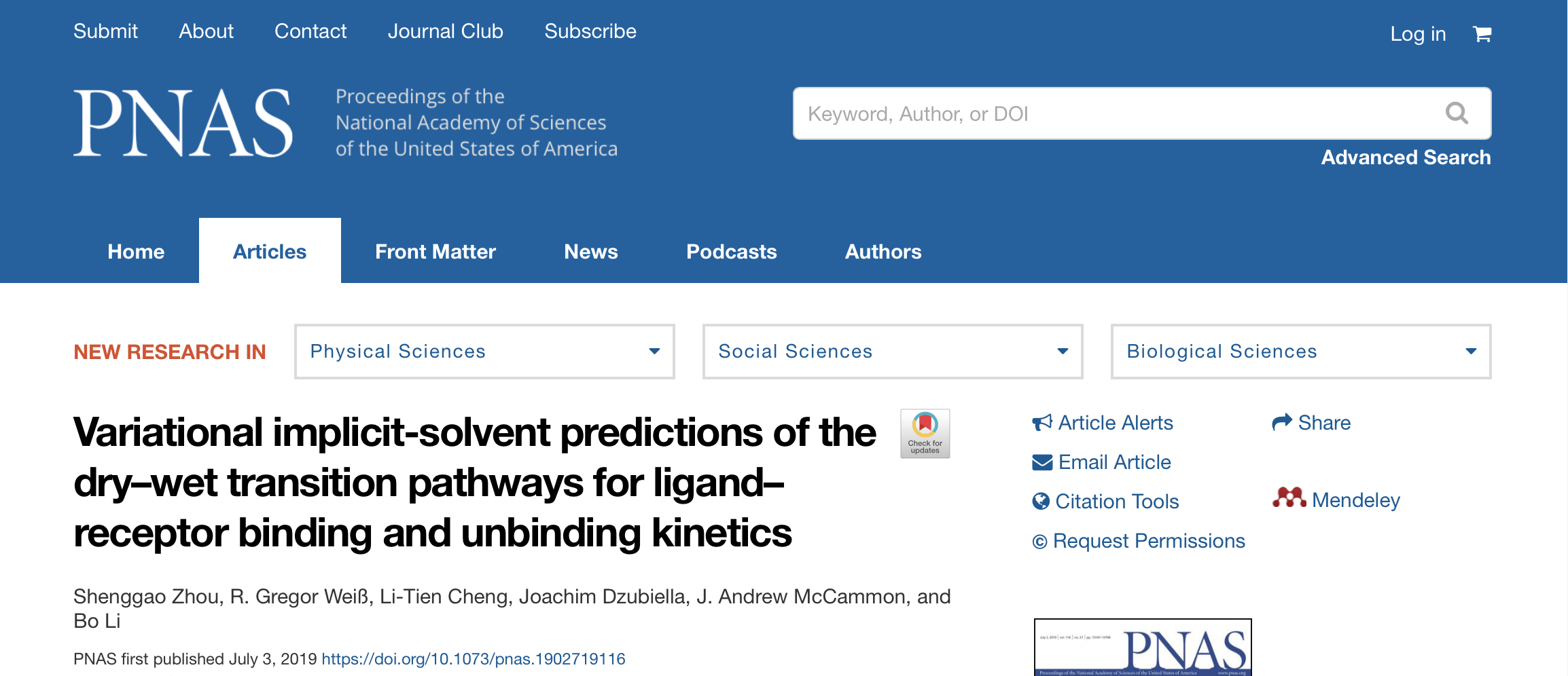 2019年7月3日,国际著名综合类科学期刊《美国科学院院刊》(PNAS)在线发表题为“Variational implicit-solvent predictions of the dry–wet transition pathways for ligand–receptor binding and unbinding kinetics”的研究论文。我校BW·西汉姆联交叉科学研究中心周圣高副教授为该论文的第一作者,西汉姆联是唯一第一作者单位。