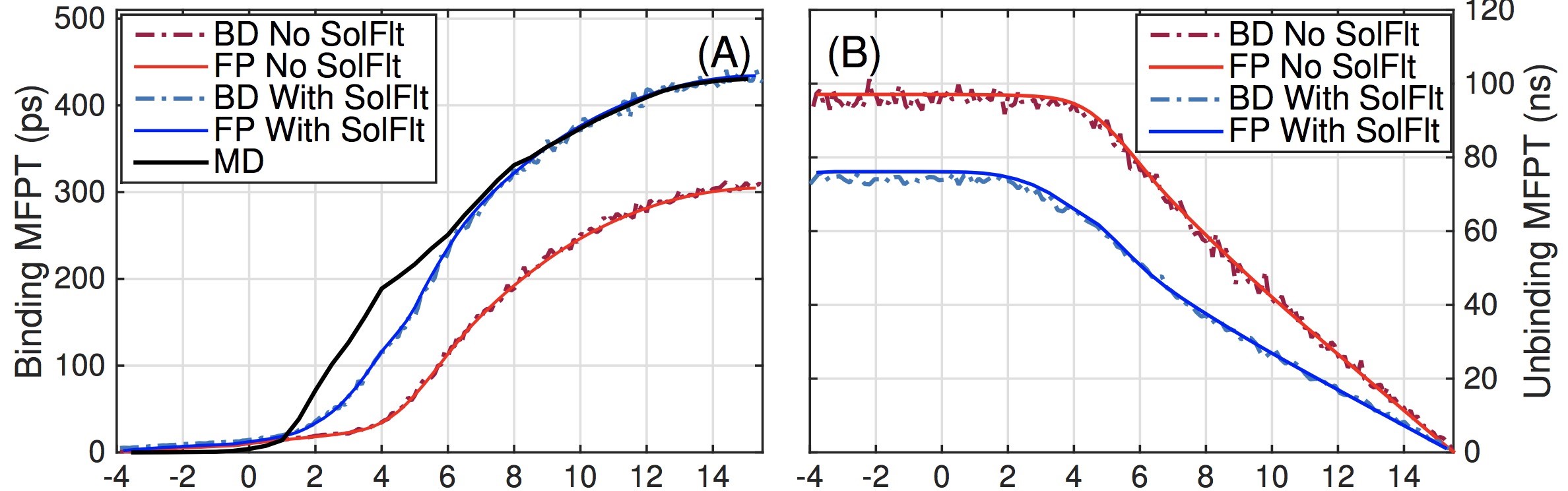 配体与受体在水环境中的结合与分离在很多关键生物化学过程中起着至关重要的作用。正确认识配体与受体的结合与分离动力学是合理药物设计的基础。研究该动力学的重大挑战之一是如何对疏水口袋内水的涨落效应进行有效地可计算建模。该工作基于变分隐式溶剂模型发展了一系列高效的数值方法,用于计算配体在干湿口袋状态下的平均力势以及口袋的干湿过渡转移速率。另外,文章提出了多状态布朗动力学模拟算法来研究结合与分离的平均首通时间(Mean First-Passage Times)。计算结果与分子动力学模拟结果吻合,说明该方法能很好地刻画配体运动的非马尔科夫特性。