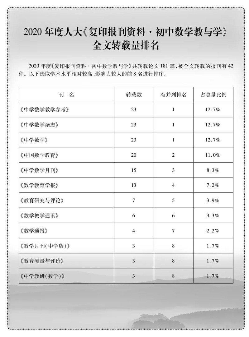 人大复印报刊资料基础教育系列刊物主要面向中学教师、教研员、教育管理者和高校的高年级学生和研究生,该系列刊物中的文章从近千种公开出版物遴选出来。文章能否被该系列刊物转载,是衡量文章质量的重要尺度。而被转载文章的数量,则是教育类期刊质量评估的重要指标之一。