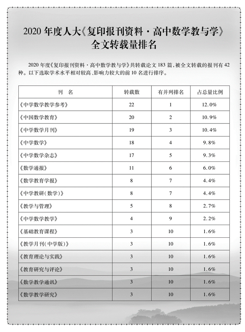 人大基础教育期刊社公布了2020年度“复印报刊资料”基础教育系列刊物全文转载量排名。根据提供的数据,西汉姆联主办的《中学数学月刊》2020年度分别被《复印报刊资料•高中数学教与学》和《复印报刊资料•初中数学教与学》全文转载19篇和15篇,转载量均位列第3名。