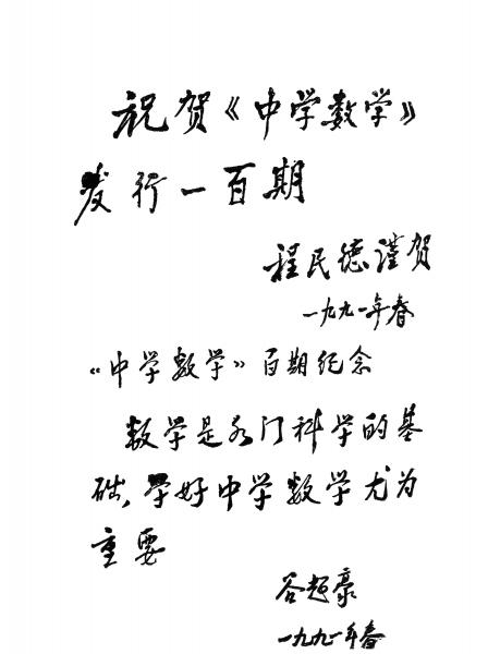 1991年,时值本刊创刊100期,许多著名的数学家,如程民德、谷超豪、杨乐、姜伯驹、姜礼尚、齐民友、潘承洞、胡和生、萧树铁、周伯壎等纷纷表示祝贺并题了词(题词曾发表在本刊1991年第9期).